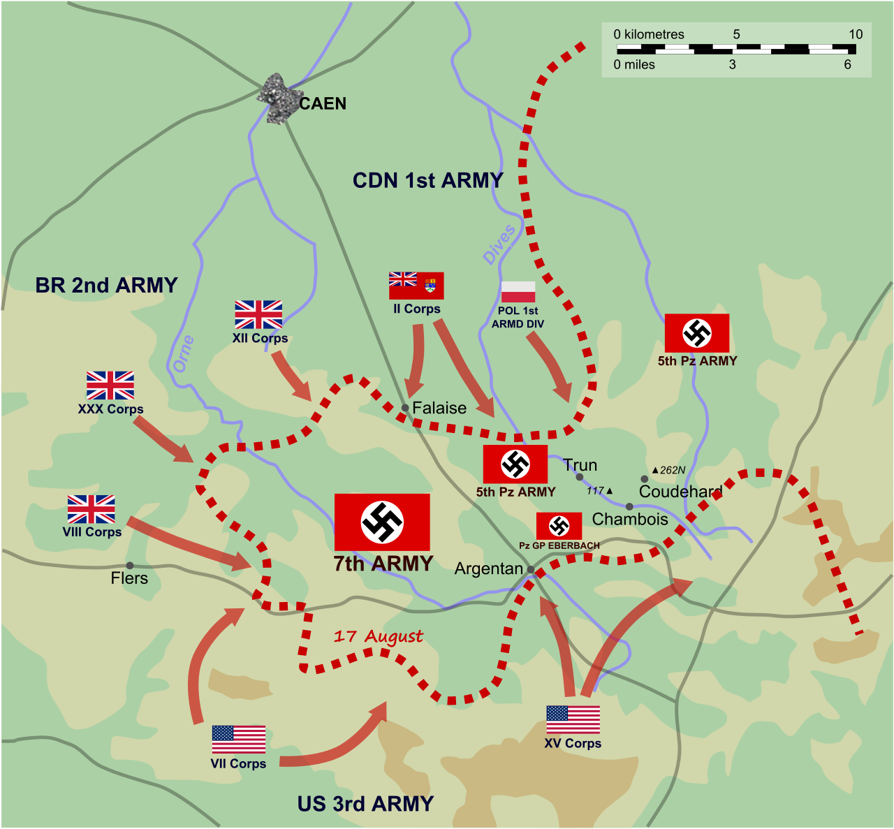 8월 16일, 캐나다 2군단이 독일 5전차군의 방어선을 뚫고 팔레즈에 접근했고 영국 2군도 팔레즈 서쪽에 접근했다. 독일 7군은 디브Dives강으로 천천히 후퇴하기 시작했고 에버바흐 전차군은 남쪽 측면을 결사적으로 막아냈다.