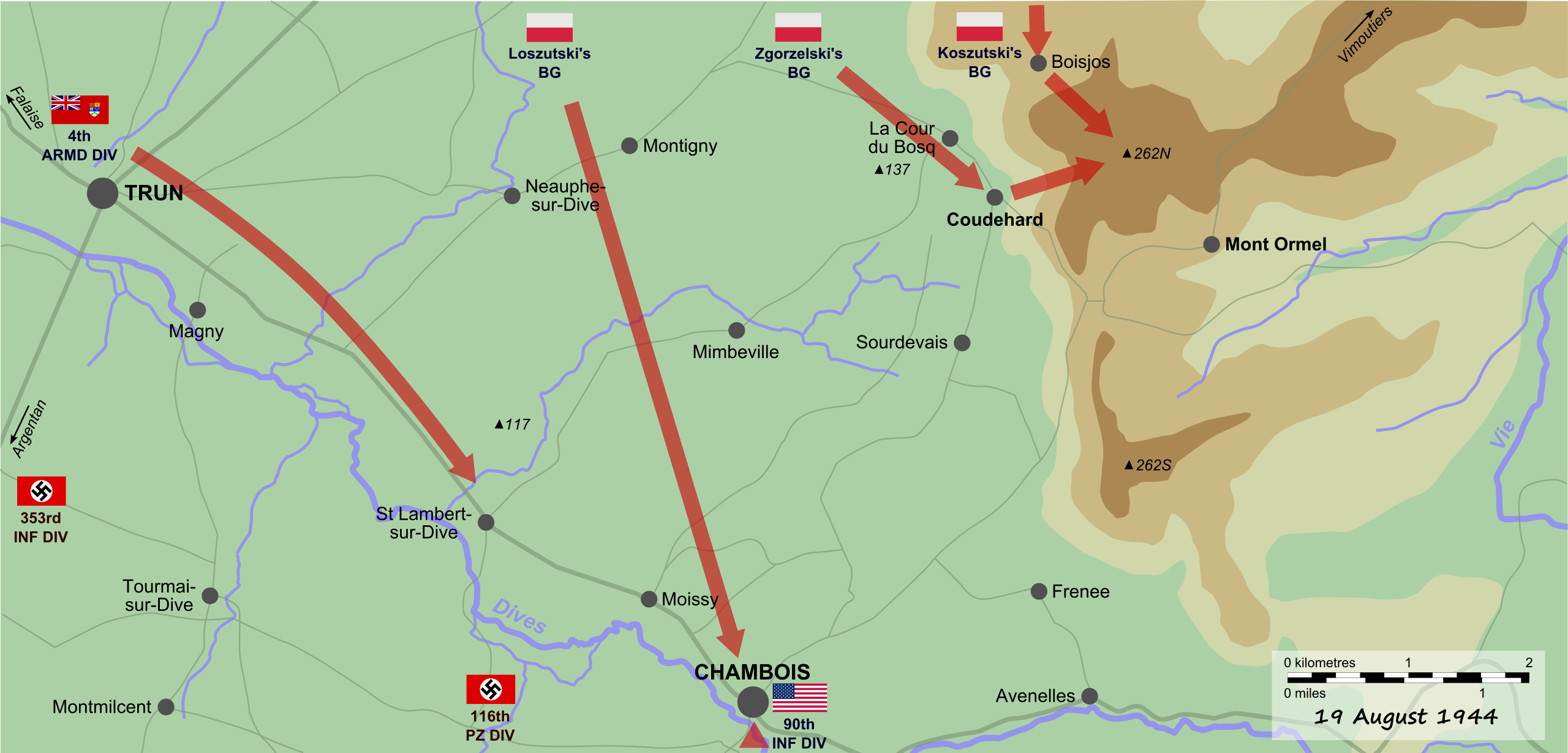 사단장 마체크Maczek은 우연히 도착한 이 고지가 디브강을 내려다보는 전략요충지라는 것을 알아채고 방어태세를 굳혔다. 포위망에서 빠져나가려고 이곳을 지나는 독일군에게 포격을 퍼붓고 디브계곡으로 병력을 보내 셩부와를 공격하기 시작했다. 이제 독일군에게는 3개의 좁은 다리와 오솔길이 탈출구 전부였다.
