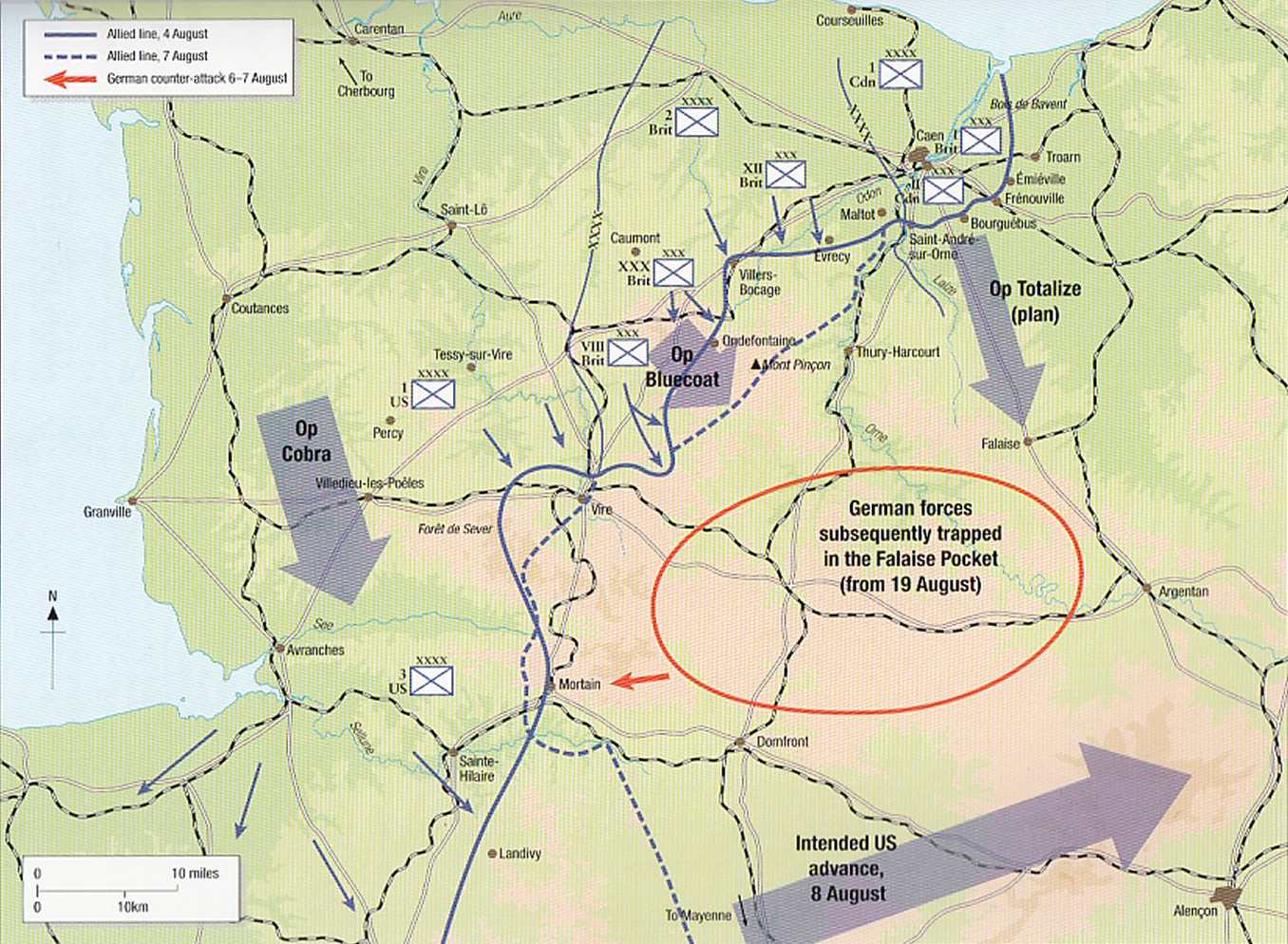너무 늦은 상태였다. 8월 12일, 미 5와 29군단이 다시 공세로 나서며 독일 7군의 좌익을 강하게 압박했다. 더 남쪽의 7군단도 북동진해서 15군단과 포위망을 연결하려고 했다.