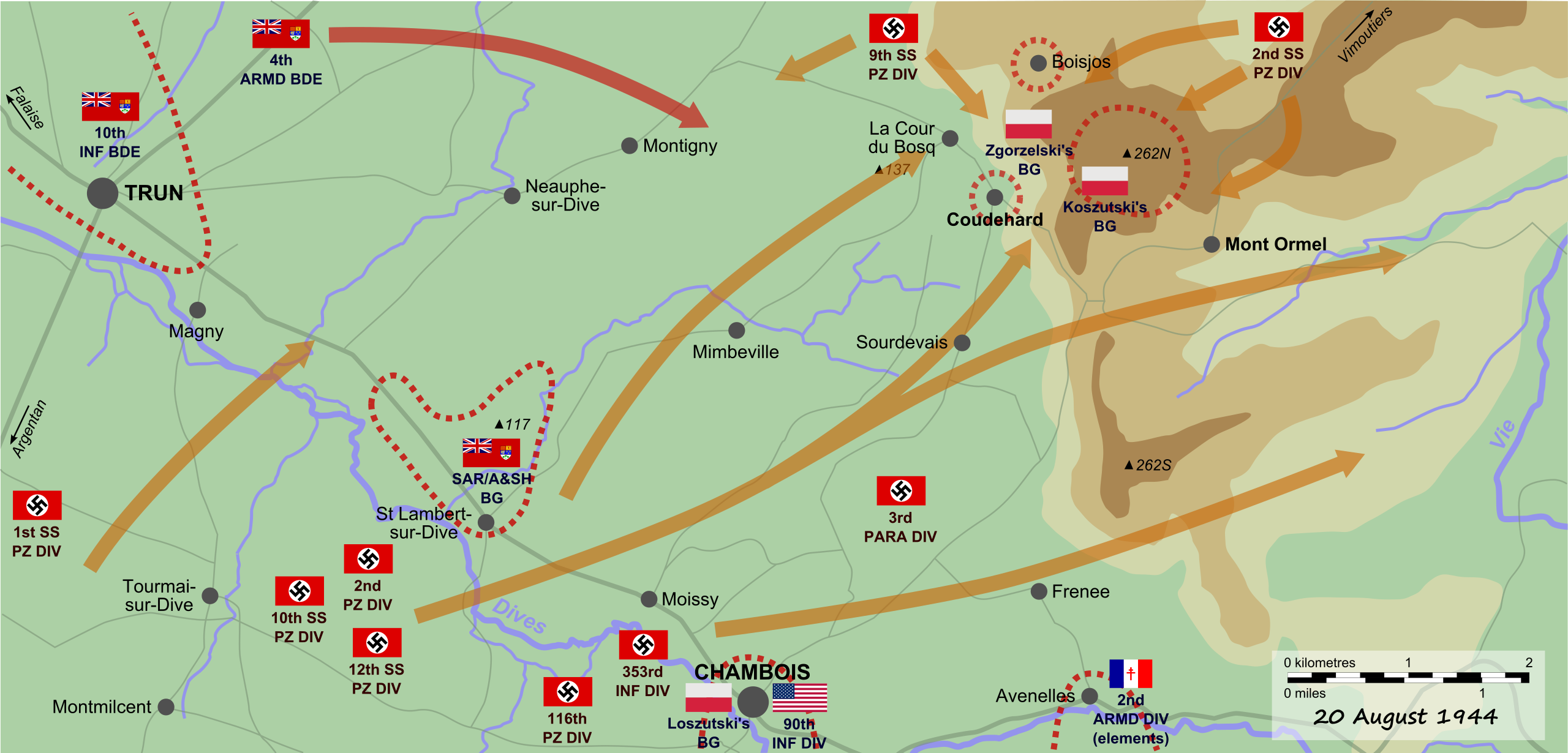 8월 20일 내내 몽 오르멜Mont Ormel(225고지)에서 격전이 벌어졌다. SS부대는 폴란드군을 몰아내고 탈출로를 확보하려고 전력을 다했지만 폴란드군은 조금도 물러서지 않았다. 포위망이 뚫릴 때마다 반격에 나서 전선을 다시 복구했다. 연합군은 고립된 폴란드군에게 공중보급했다.