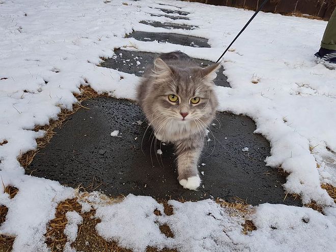 시베리안은 야생종이어서 털이 3중이고 큰 발에 털까지 나서 이렇게 눈에서도 추워하지 않습니다. 대신에 여름에는 사람보다 더 끔찍하게 모셔야 합니다.