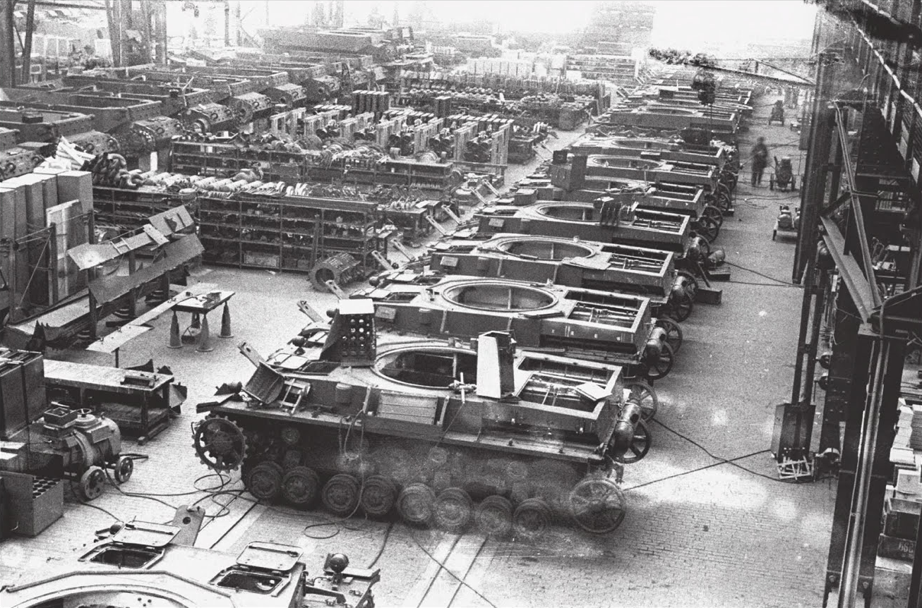 1943년 당시, 독일최대 전차제조업체 3곳은 오스트리아 상트 발렌틴St Valentin의 니벨룽겐베르케Nibelungenwerke, 작센 플라우엔Plauen의 포마크VOMAG, 마그데부르크Magdeburg의 크루프 그루존베르크Krupp Grusonwerk로 9,000명의 인력이 독일전차 52%를 생산했다.