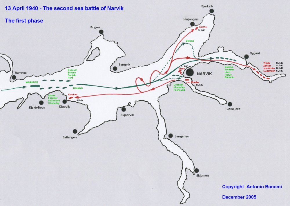 영국구축함이 대양쪽으로 항해하자 거대한 독일상선과 마주쳤다. 포격 2발만으로 항복을 받아냈고 두 발을 더 쏘아서 침몰시켰다. 독일군은 나르비크를 계속 점령했지만 이제 보급을 받을 구축함이 없었다.