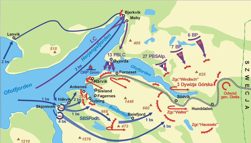 4월 12~5월 2일, 연합군 11,000명이 욘달스네스Andalsnes와 몰데Molde(시클Sickle군), 남소스Namsos(모리스Maurice군)에 상륙했고, HMS 글로리어스의 글로스터 글레디에이터 전투기편대가 공중엄호했다.