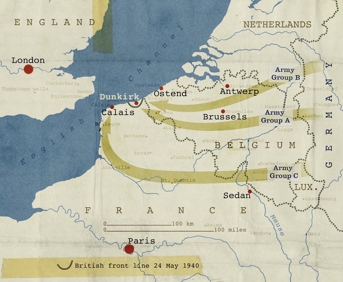 연합군이 아직 불로뉴Boulogne와 칼레Calais를 방어하고 있었지만 덩케르크Dunkirk, 더 정확하게는 해변에서 초대형 철수작전을 당장 시작해야 할 판이었다. 이미 항구의 도크는 공습으로 파괴되거나 차단되었고 프랑스해군사령관 장 아브리알Jean Abrial이 독일군의 공격에 대비해 해군선박과 선원을 바다로 대피시켜 놓았다.