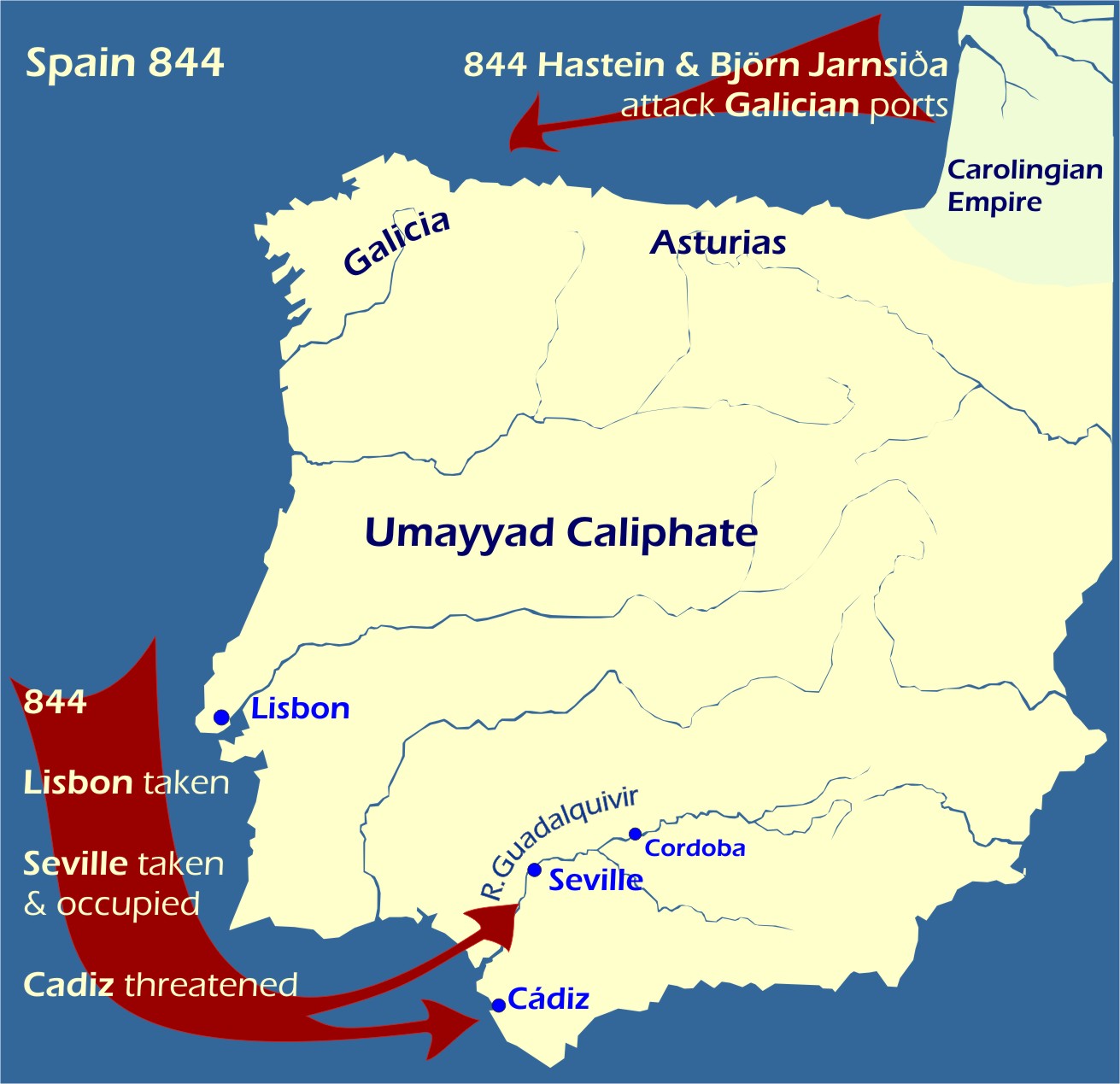 844년, 바이킹은 처음으로 지중해에 발을 들여 놓았다. 100척의 대함대가 프랑스 아키텐Aquitaine을 출발해 스페인남부 히혼Gijon과 코루냐Coruña를 공격했다. 기독교 아스투리아인Asturian의 거친 저항을 받고 이베리아Iberia반도를 돌아 리스본Lisbon을 약탈했고 카디스Cadiz를 공격한 후에 세비야Seville를 점령하고 코르도바Córdoba를 위협했다.