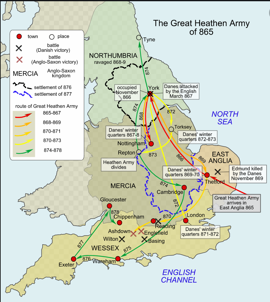 이후 수 십년 동안, 롱십이 갑자기 나타나서 영국해안의 수도원과 정착지를 약탈하고 사라졌다. 이런 소문이 퍼지자 수도승은 성물을 모아 은신처로 숨었다. 바이킹의 약탈로 많은 기록이 함께 파괴되었다. 데인족은 9세기 중반에는 아예 영국에서 겨울을 보냈고 866년, 이교도대군Great Heathen Army은 요크를 점령했다. 뼈없는 이바르(아이바)Ívarr the Boneless와 할프단 라그나르손Hálfdan Ragnarsson이 이끄는 바이킹대군이 메르시아Mercia, 노섬브리아Northumbria, 이스트앵글리아East Anglia와 엑세스Wessex 4개 왕국을 공격했다. 할프단은 요르비크Jórvík(스칸디나비아 요크)의 첫 번째 왕위에 올랐고 더블린왕위도 주장했다.