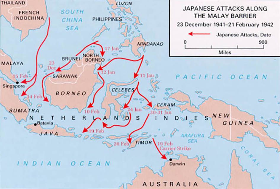 1942년 1월, 미국, 영국, 네덜란드, 오스트레일리아 연합해군사령부가 자바Java에 설치되었고 이리 저리 긁어모은 전투함이 싱가폴로 가는 수송선단을 엄호했다. 싱가폴 해군기지는 이미 큰 피해를 입었고 일본군이 2월 9일에 싱가폴까지 진격했다. 싱가폴을 포기하고 가능한한 많은 병력과 민간인을 수송했다.