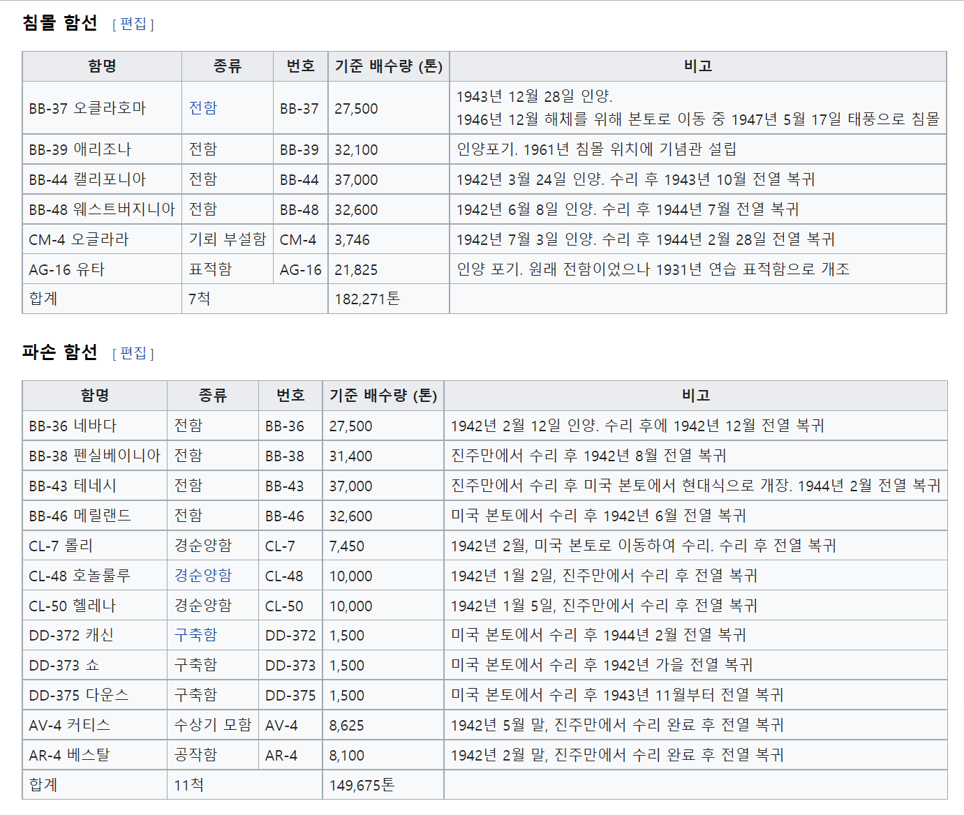 94척의 선박 중, 18척이 침몰하거나 반파되었고 8척은 전함이었다. 기함인 애리조나Arizona는 어뢰 1발과 폭탄 8발을 맞아 폭발하면서 1,404명과 함께 침몰했다. 캘리포니아California도 98명이 죽었고 3일 후에 침몰했다.