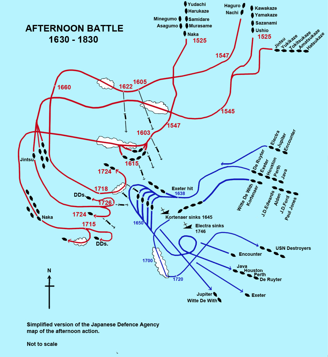 3월 1일, HMS 엑서터, 인카운터와 USS 존 디 포프John D. Pope는 적의 협공에 잡혀서 엑서터와 인카운터가 포격과 어뢰를 맞고 침몰했고 존 디 포프도 얼마 후에 침몰했다. 생존자 800명은 일본군에게 구조되었지만 포로상태에서 많이 죽었다.