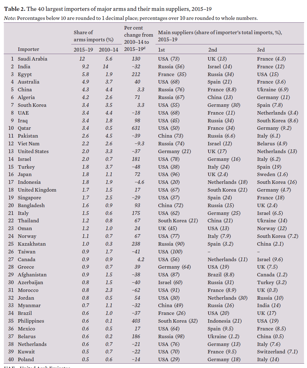 2010~14년과 2015~19년을 비교하면, 중동은 61%, 유럽은 3.2% 무기수입이 증가한 반면에 아프리카는 –16%, 미국은 –40%, 아시아와 오세아니아는 –7.9% 감소했다.
