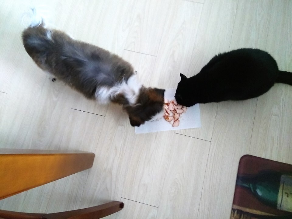 서로 얼굴을 맞댄 지가 2년이 되어가는데도 쿠로가 좀처럼 곁을 내주지 않습니다. 그런데 재미있게도 추르 간식을 먹을 때에는 바로 앞에서 서로 나눠 먹어도 조용한 자본주의적, 선택적 하악질입니다.