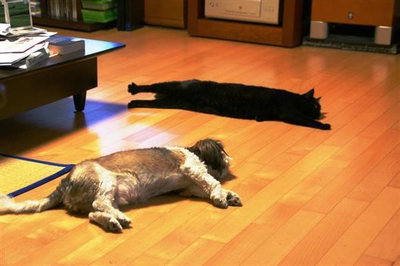 앞과는 정반대의 경우입니다. 시츄 이녀석이 워낙 소심한 무색무취의 성격이어서 (길냥이출신) 쿠로가 들어온 첫날부터 같이 자빠져 자는 놀라운 풍경이 벌어졌죠.