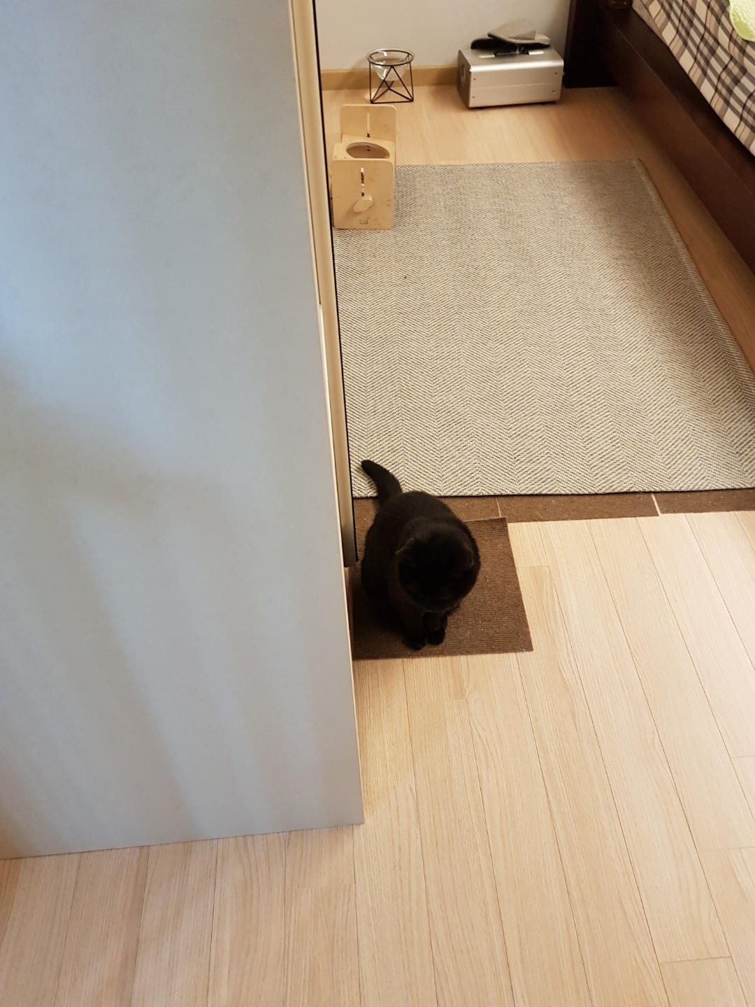 가구를 재배치하고 낮은 창문에 필름을 붙여서 밖을 보지 못하게 했다. 그리고 기쁨이가 지내는 공간을 높이고 간식 퍼즐이나 사냥놀이감을 두었다.