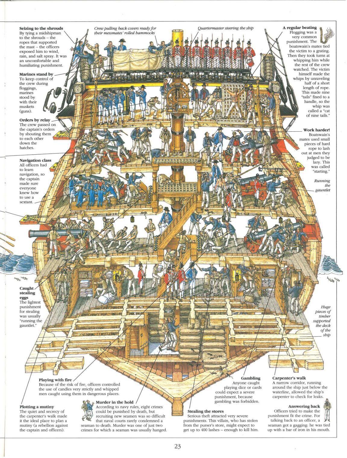 영국해군은 대부분 항구에 정박하거나 대륙봉쇄선을 따라 순찰하며 보냈고 해전은 드물었다. 선원의 삶은 지루함 그 자체였다. 선원은 갑판을 닦고 칠하고 보수했다. 전열함man of war의 춥고 어두운 갑판 아래에서 많은 시간을 보냈다. 그렇기 때문에 규칙과 규율이 무엇보다 중요했다.