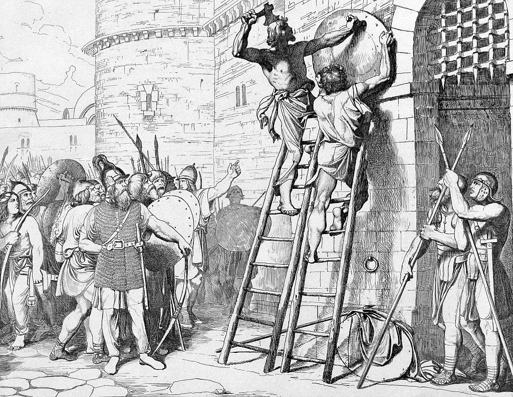 콘스탄티노플리스 성문에 방패를 거는 모습입니다. 당시 비잔티움제국의 상태를 알 수 있습니다.
