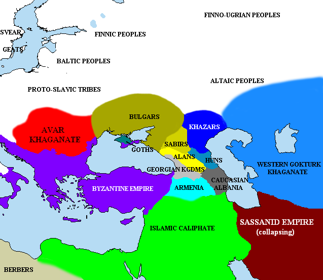 아바르족은 불가르Bulgar족. 다시 하자르Khazar족으로 대체되었고 7세기 말까지 비교적 평화스러운 시간이 지났다. 하자르족은 훨씬 좋은 기록을 남겼다. 투르크 카자르족은 교역에 관심이 있었고 외국의 영향에 우호적이었다. 기독교선교사를 반겼고 유대교를 수용했다.