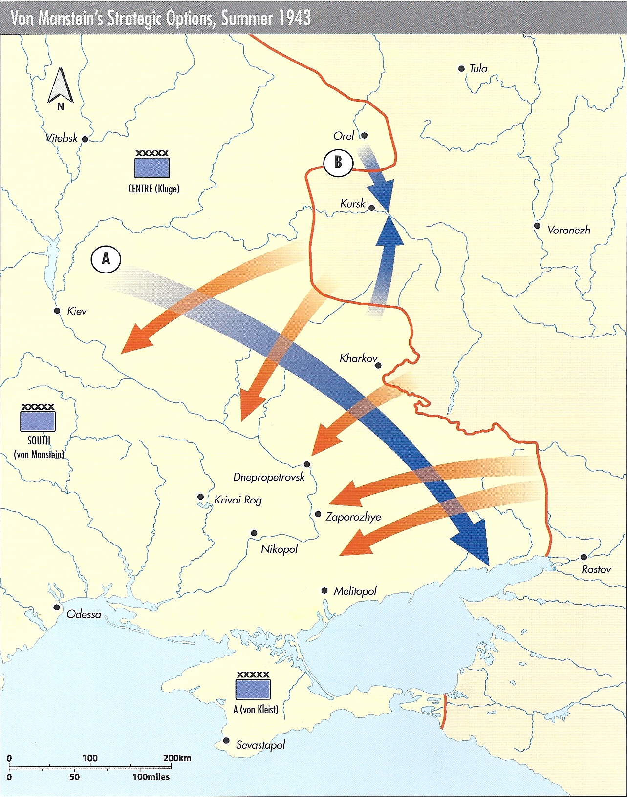 2차대전 최고의 명장인 만슈타인은 스탈린그라드 패전 후에 붕괴하는 전선을 단 한 번의 반격으로 메웠고, 이후 전투에서도 쿠르스크공세가 아니라 지도의 A안처럼 소련군이 공격해 오게 유도하고 포위섬멸해야 한다고 주장했습니다. 히틀러가 거부하자 소련군이 대비하기 전에 준비가 부족해도 바로 공격해야 한다고 했는데 이것도 안듣죠.
