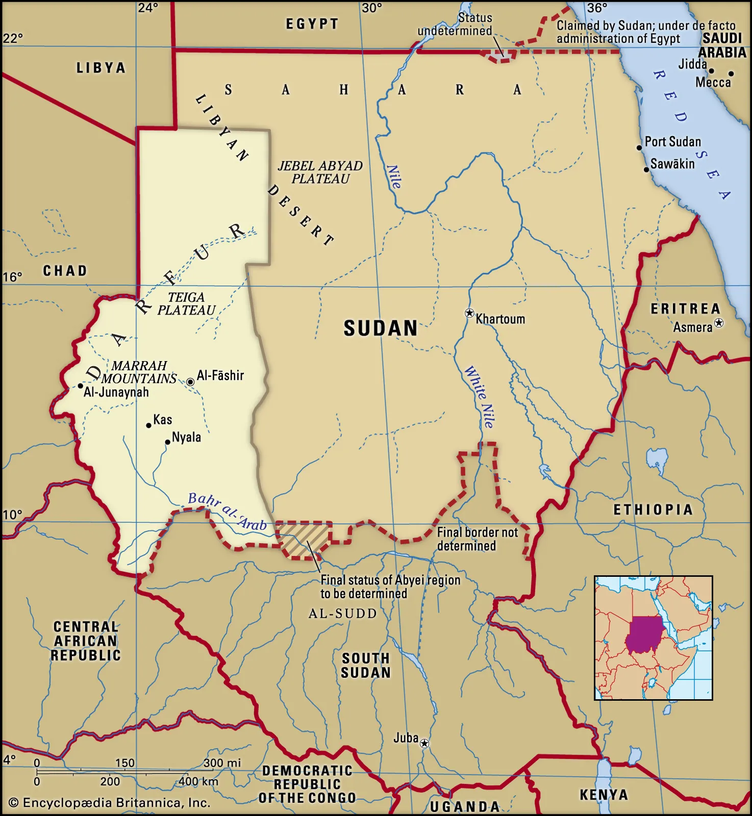 마후디스트Mahdist국(녹색 부분)은 1898년까지 수단을 통치하다가, 영-이집트군에게 정복당했다. 영-이집트정권 후에, 다르푸르왕족 후계자인 알리 디나르Ali Dinar가 왕국을 재건했다.