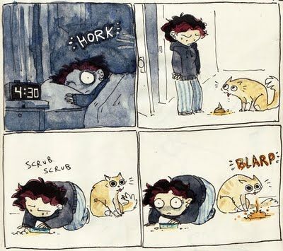 고양이는 구토 대장인 것 같을 때가 있다. 토해도 너무 자주 토한다. 보통은 헤어볼을 토하거나 너무 빨리 먹은 것을 토한다. 그렇지만 흰거품을 토한다면 빈속에서 토하고 있다는 뜻이다. 한 번 정도는 염려할 거리가 아니지만 자주 그런다면 뭔가 문제가 있다는 신호다.