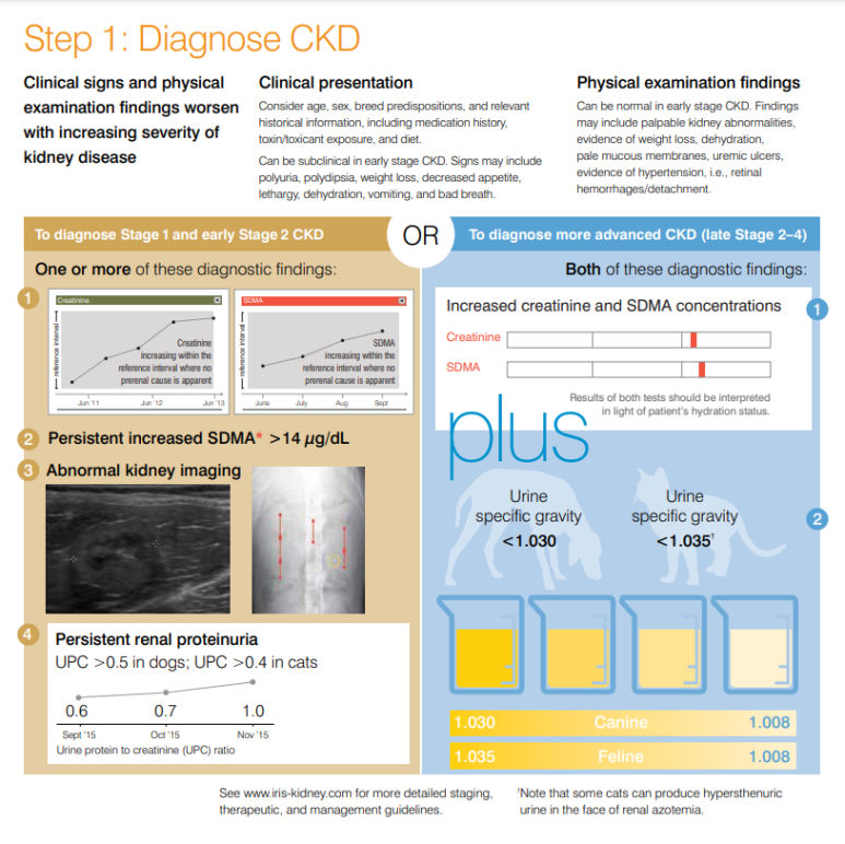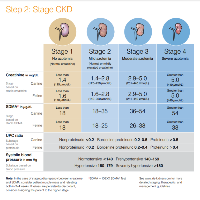 고양이의 CKD를 분류하는 첫번째 검사는 크레아티닌과 SDMA 농도를 포함한 혈액검사다. 그리고 소변의 단백질 손실과 혈압이다. 신장은 혈압을 정상적으로 유지하는데 결정적인 기능을 한다. CKD 고양이는 고혈압을 보인다.