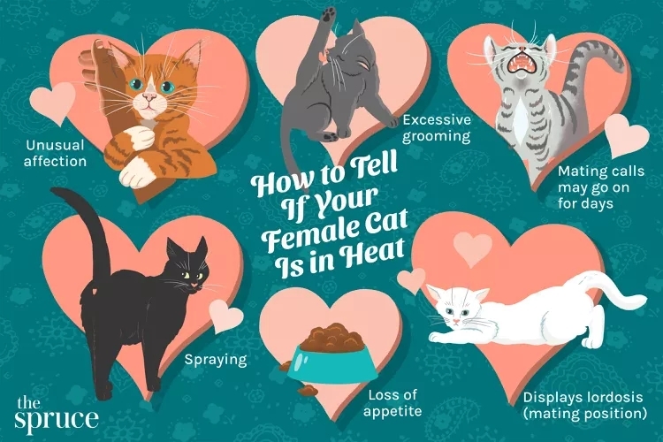 암컷 고양이가 이전과 다른 애정표현을 한다. 게걸음을 걷거나 다른 고양이, 주인, 장난감, 가구에 하체를 비빈다. 꼬리를 세우고 교미자세를 취하기 때문에 고통이나 불안상태와 구분할 수 있다.