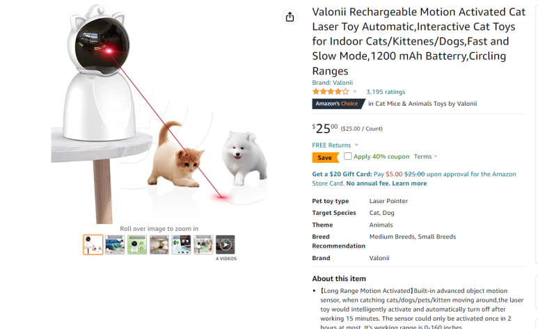 배터리 요구 사항이 문제이거나 더 완전한 기능을 갖춘 자동 고양이 레이저 장난감을 찾고 있다면 발로니 충전식 모션 활성화 고양이 레이저 장난감이 좋은 선택이다. 이 장난감의 가장 큰 특징은 모션 센서로, 고양이가 장난감을 찾으러 오면 레이저가 스스로 작동한다. 2시간에 한 번만 동작하는데 동작할 때마다 15분 동안 지속된다.
