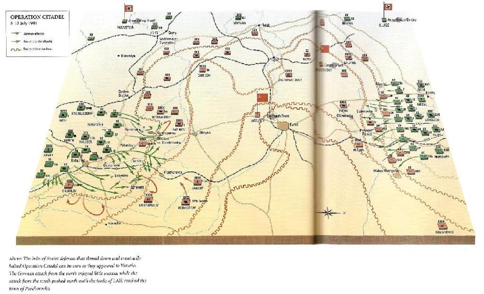 성채작전은 지도처럼 양동작전으로 몇백만명의 소련군을 궤멸시키고 단숨에 전황을 역전시킨다는 엄청난 계획이었고 독일군의 거의 모든 전력을 쏟아부었습니다. 그렇지만 신형전차 판터 등의 투입을 위해 작전이 계속 지연되었고 소련군은 이미 그 계획을 모조리 입수해서 작전개시 직전에 거꾸로 대대적인 포격을 퍼부을 정도였습니다.