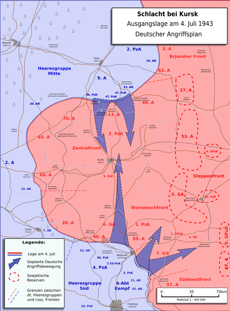 쿠르스크 양쪽의 전선을 연결시키면 독일 전선을 150km 단축할 뿐만 아니라 중앙과 남부전선의 경계에서 협공으로 적을 고립시킬 수 있었다. 소련군은 작전이 지연되는 동안 방어진지를 더욱 두텁게 했다. 또한 예비병력까지 끌어 모았기 때문에 작전이 쉽지 않을 것이라는 것을 알고 있었다. 소련군은 장교와 병사들의 훈련에서 큰 성과를 이뤘고, 우리가 맞닥뜨릴 적은 더 이상 1941-2년의 병사가 아니라 전투 효율성과 사기 면에서 우리와 동등한 병사라는 것을 알게 되었다.