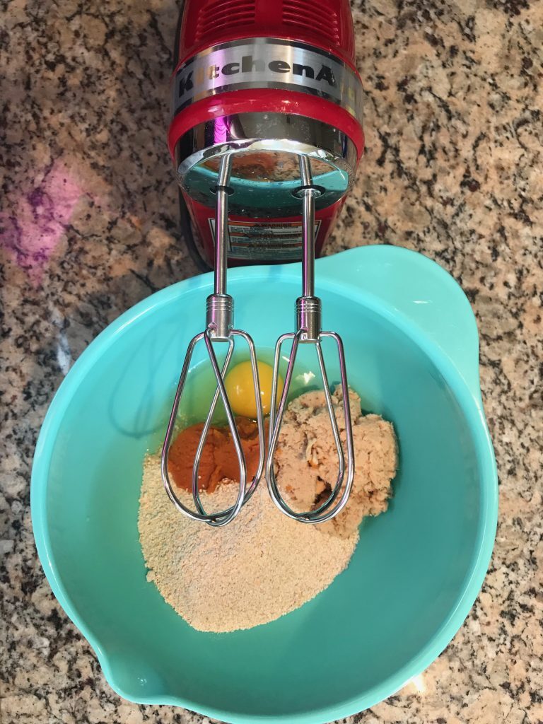연어를 넣고 반죽 갈고리가 달린 핸드 믹서를 사용하거나 숟가락으로 연어를 잘게 부수어 달걀 혼합물과 섞어줍니다.