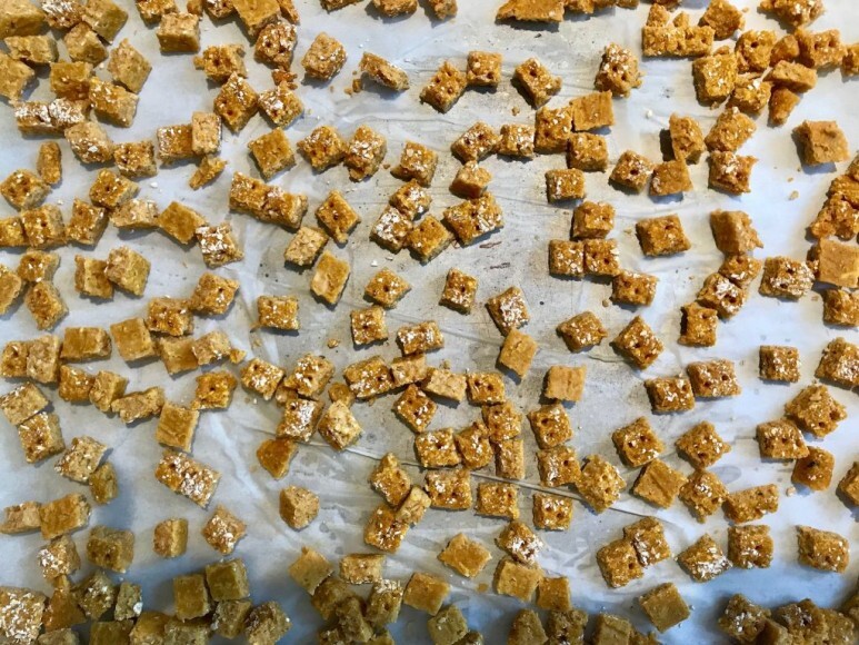 15분간 구운 다음 오븐에서 꺼내 조각각모양으로 자릅니다(제 것은 정사각형으로 약 1cm 정도). 피자나 페이스트리 휠을 사용하면 이 작업을 쉽게 처리할 수 있습니다!