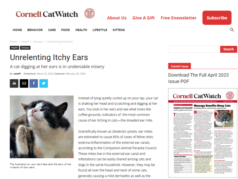 코넬대학교 동물병원 피부과 임상 조교수인 줄리아 밀러Julia E. Miller 수의사는 "고양이 귀에 문제가 있는 경우, 고양이가 매우 날카로운 발톱으로 자상이나 손상을 입힐 수 있기 때문에 가능한 한 빨리 수의사에게 진찰을 받아야 한다"고 말한다. 진드기에 심하게 감염된 고양이는 머리를 기울이고 귀를 긁어 출혈 상처가 생길 수 있다. 귀 조직이 손상된 부위에 이차 세균감염이 발생하여 화농성 분비물이 생길 수 있다.