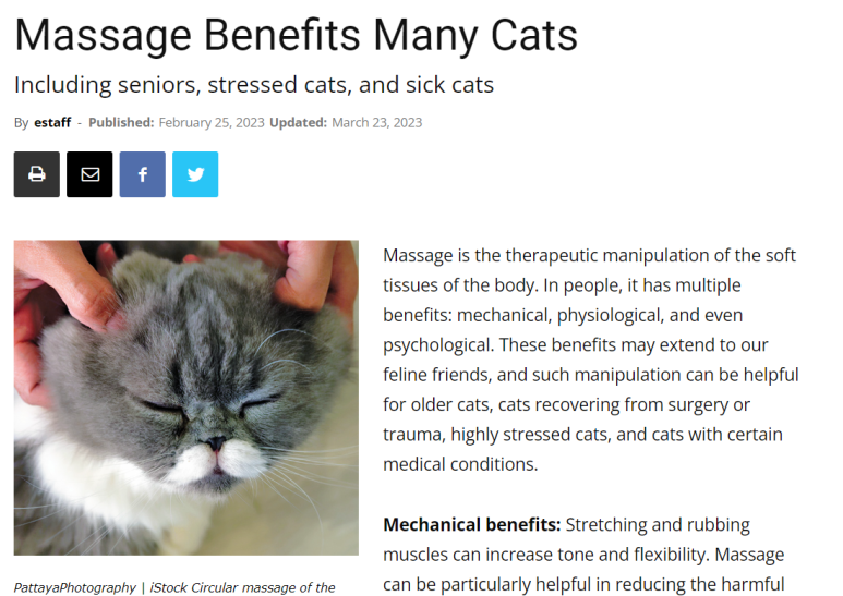 마사지는 신체의 연조직을 치료적으로 조작하는 것이다. 사람의 경우 기계적, 생리적, 심지어 심리적 등 여러 가지 이점이 있다. 고양이 친구들에게도 도움이 되는데, 이러한 마사지는 노령 고양이, 수술이나 외상으로부터 회복 중인 고양이, 스트레스가 심한 고양이, 특정 질병을 앓고 있는 고양이에게 도움이 될 수 있다.