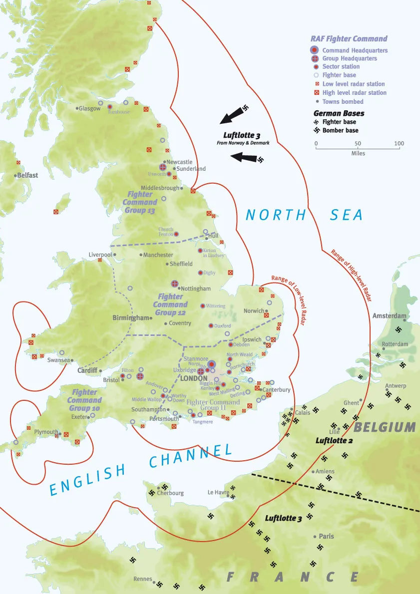 1936년, RAF는 훈련, 해안, 폭격기, 전투기사령부, 4개의 사령부로 조직되었다. 전투기사령부는 지리적으로 4개의 '그룹'으로 조직되었다. 남동부에 위치한 11그룹이 전투의 최전선을 담당했습니다. 전투가 시작될 당시 약 650대의 항공기와 1,300명의 조종사를 보유하고 있었다.