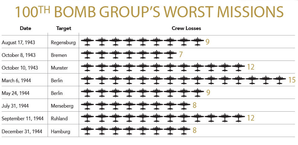 100폭격대가 '피투성이 100번째'라는 별명을 얻게 된 것은 단지 몇 번의 험난하고 격렬한 임무에서 큰 손실을 입었기 때문이다.