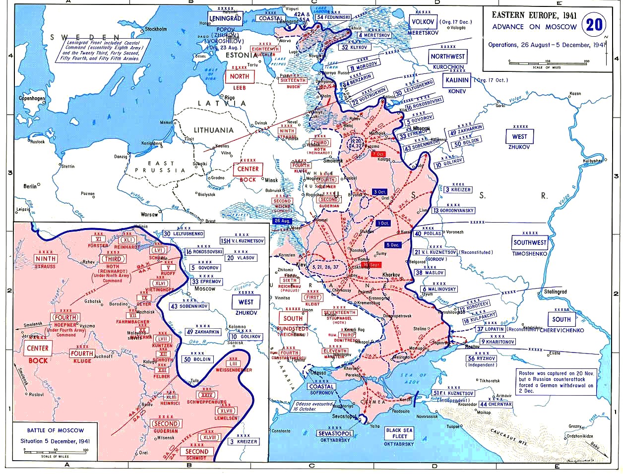 독일군 중앙집단군Heeresgruppe Mitte은 탄약은 고사하고 겨울군복도 없이 겨울 눈 속에 갇혀 있었고, 러시아군의 반격으로 그 대가를 치르게 되었다. 전사에서 가장 강력했던 바르바로사 침공군은 눈 속에서 궤멸된 채 죽어갔다.